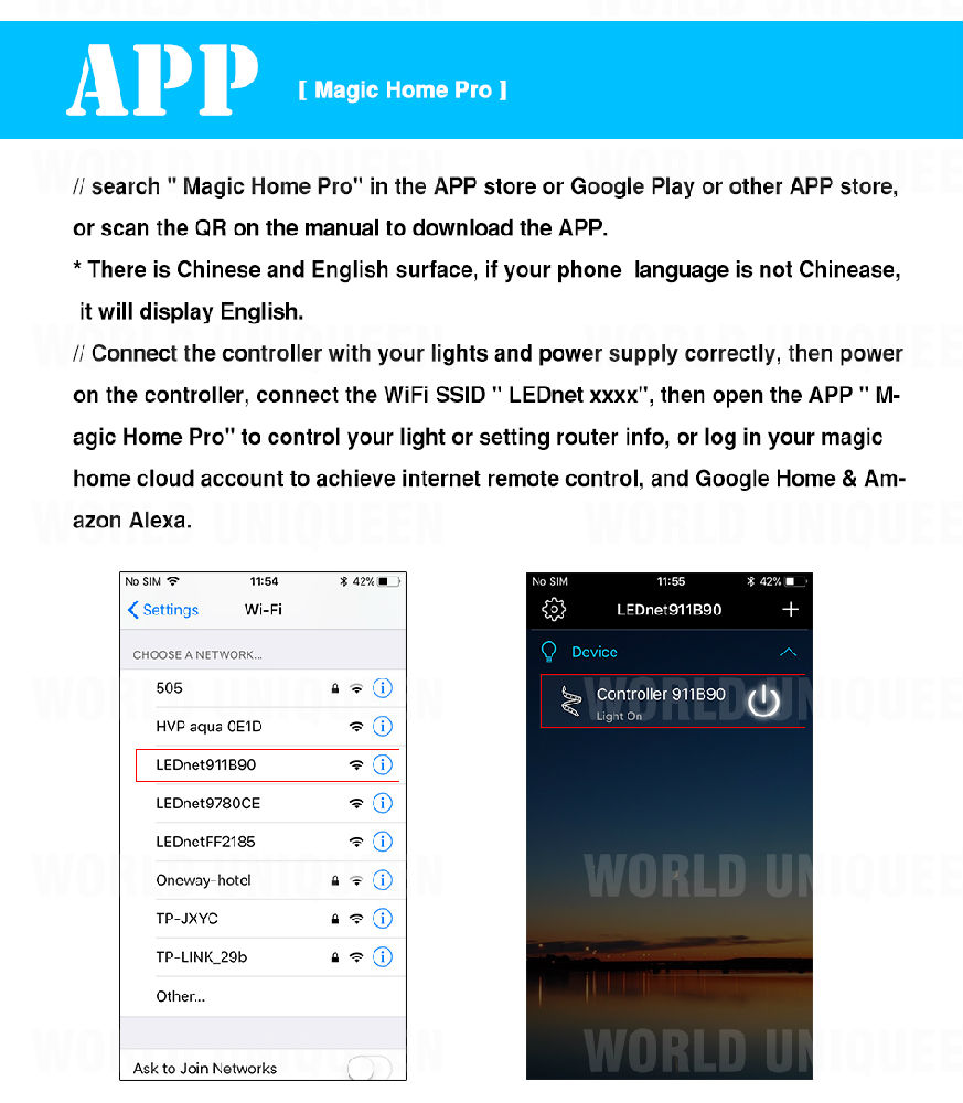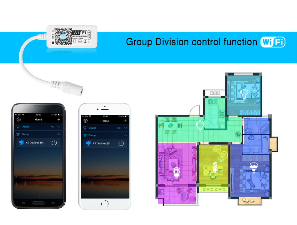 Connecting way: V + R, G, B LED light, V+, V-power supply, ANT for WiFi signal receiving