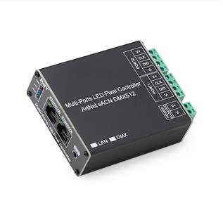 This is a small type Artnet to SPI signal transfer, with 2CH output, can control 24 universe light, support common RGB/RGBW return-to-zero code SPI light, like 1903,2811, 2812,SK9822